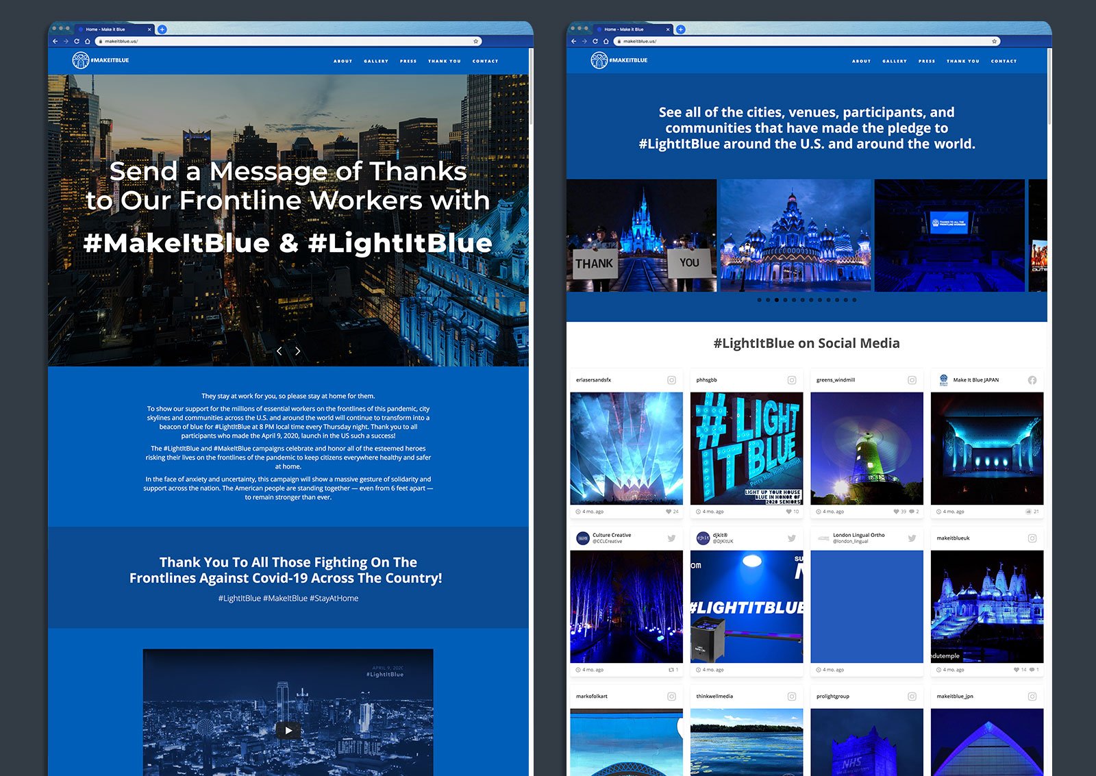 In response to the global pandemic, I led the digital design and development for #LightItBlue and #MakeItBlue—a social media and environmental movement dedicated to supporting frontline workers. What began as a local tribute in the U.K. was scaled into a global phenomenon across 22 countries. I was responsible for architecting the campaign’s digital presence and creating the technical assets that powered the movement across major international landmarks and digital hubs.